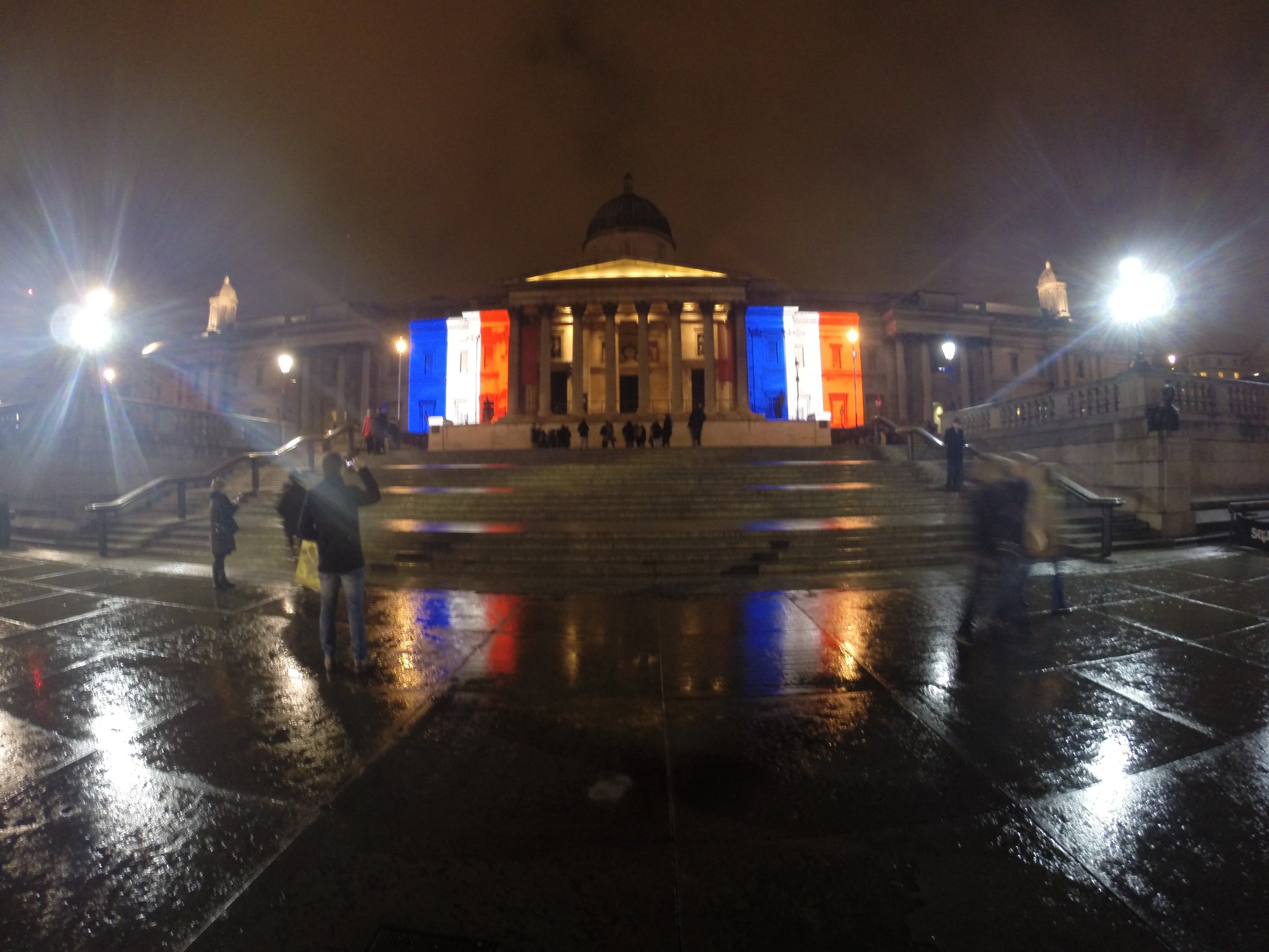 In Trafalgar Square, French flags were projected onto the National Portrait Gallery in tribute to those killed in Paris.