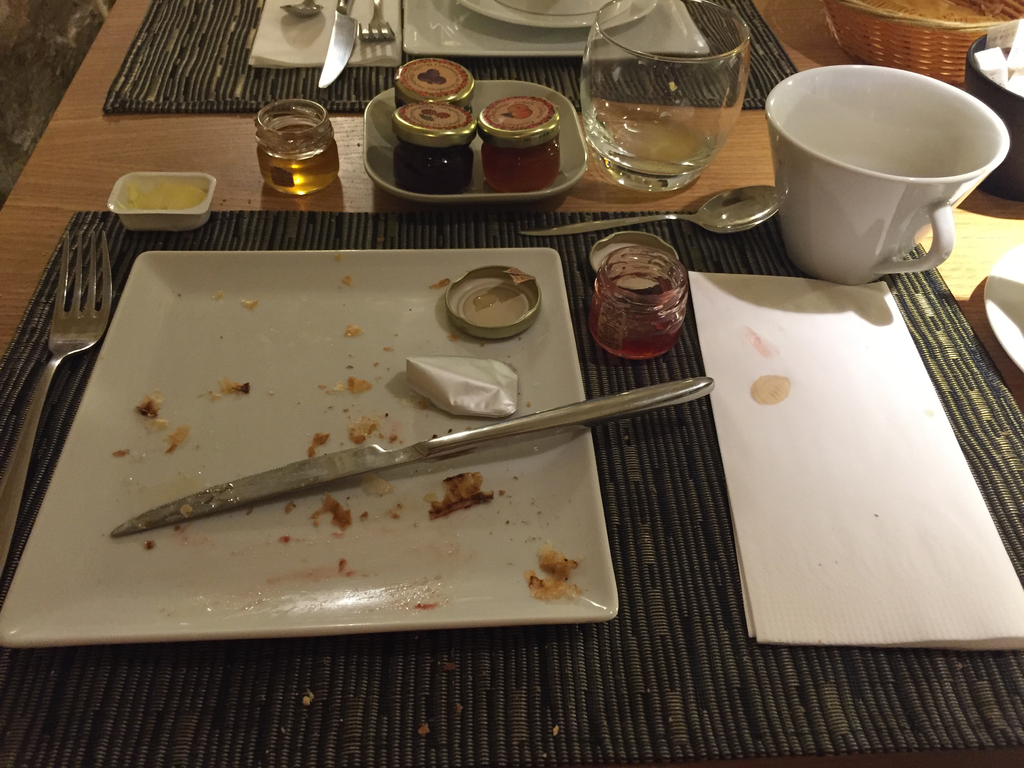 A pain au chocolate, a baguette with jam and coffee darker than the combined armies of Hades greeted me from the table.