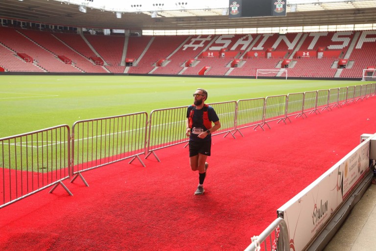 Making the most of the smooth descent from the bridge, we realised that we were a couple of minutes up on our projected half time but might as well continue while we felt good. The crowds were still great and after a couple of turns we were running on bright red carpet next to the hallowed turf of St Mary’s stadium. It was surprisingly soft and gave no bounce for runners but it was amazing as always to be there.